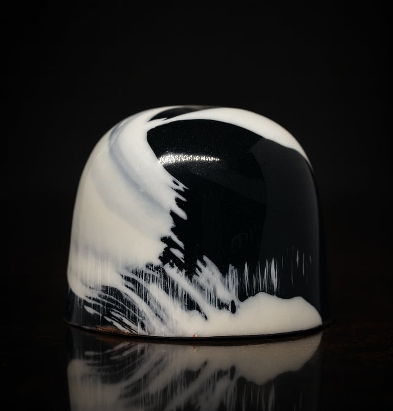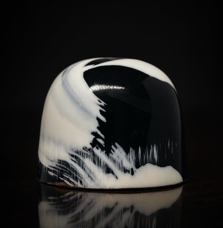 Sous une coque noire ornée d’éclats dorés se cache une ganache de chocolat noir pur, pour un plaisir brut et raffiné.